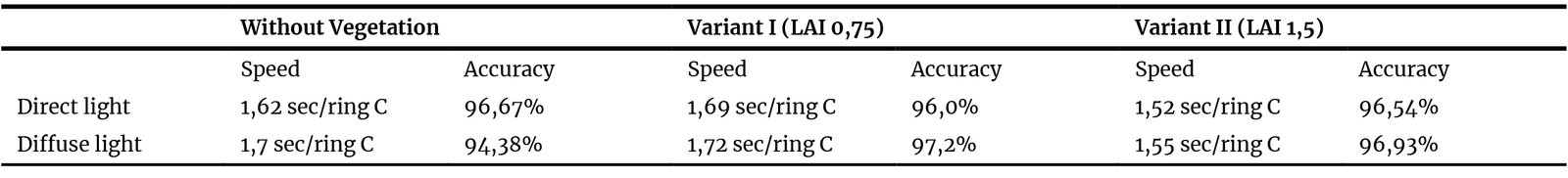 The elevated DF levels in Variant I also lead to a slight delay in visual task performance at the window-facing position. Under direct light conditions without vegetation, the response time was 1,7 seconds per ring C, which increased to 1,72 seconds in Variant I. Under diffuse light, the response time increased from 1,62 seconds (without vegetation) to 1,69 seconds in Variant I. However, accuracy improved in Variant I and was further enhanced in Variant II. The study affirms that increased foliage density enhances visual accuracy and performance.