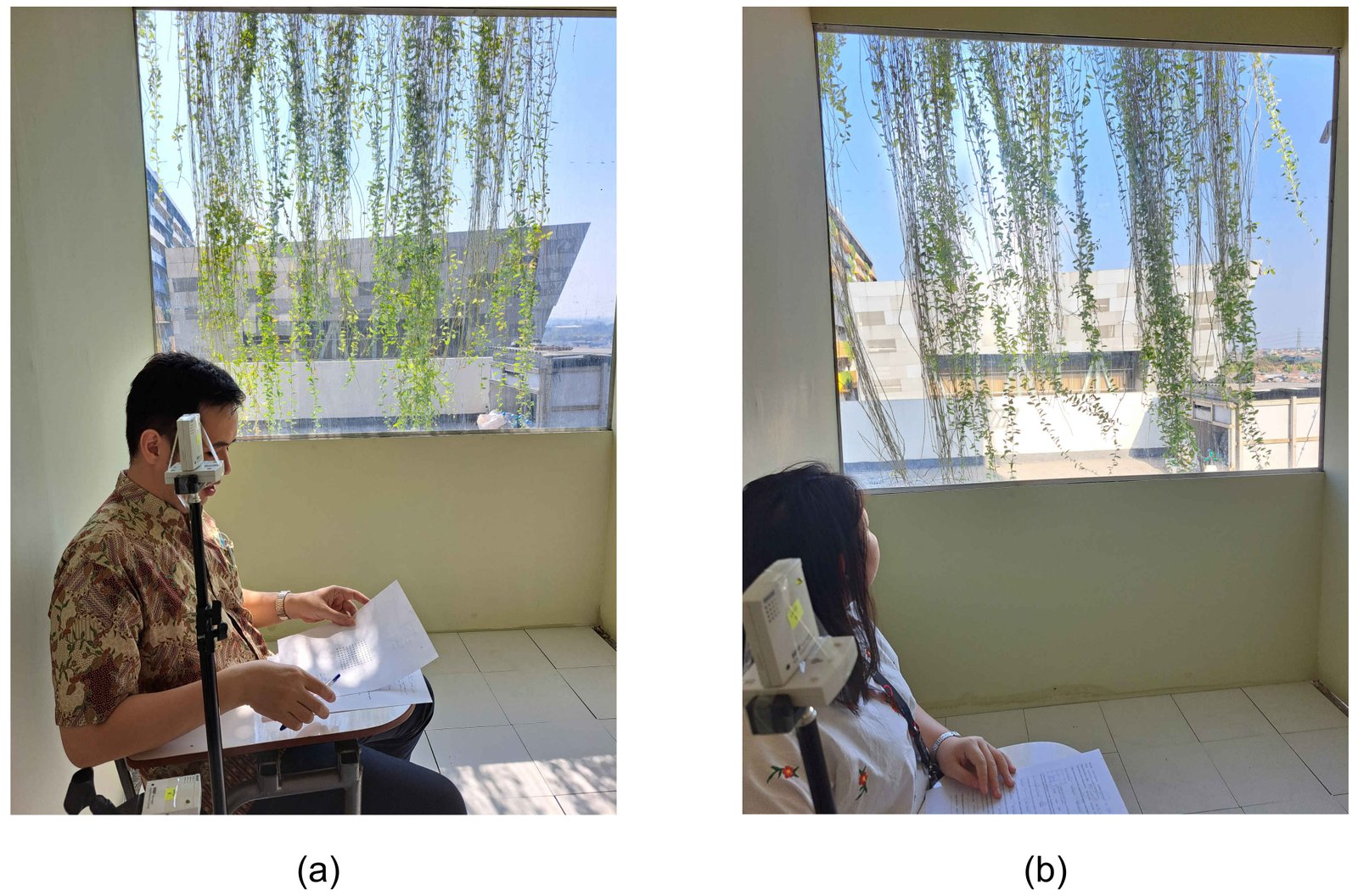 As the design of plant-based façades by architects worldwide on opaque surfaces [28,30] continues to evolve and covering glazed façade openings, this study presents a novel and critical research gap in the potential of biotic façades as glare mitigation strategies. Specifically, how vegetation on façades reduces glare while maintaining adequate daylight levels and providing natural views for office workers in high-rise buildings. A preliminary study regarding common kinds of artificial shading devices in geometry and mechanisms compared to plants has been done, showing that the leaf area as plant-geometry can be arranged to find a well-balanced solution for light environment [27,31]. This study aimed to find how different leaf area index of plants reduced high luminance on glass façade, illuminance at the working plane, and how office users perceived the quantity of light as well as the beauty of the view seen as a qualitative aspect. It is a continuation of previous analysis regarding the correlation between Leaf Area Index (LAI) to shading factor and luminance index that uses a model box [31], as well as how leaf performs in a real room with office users as respondents.