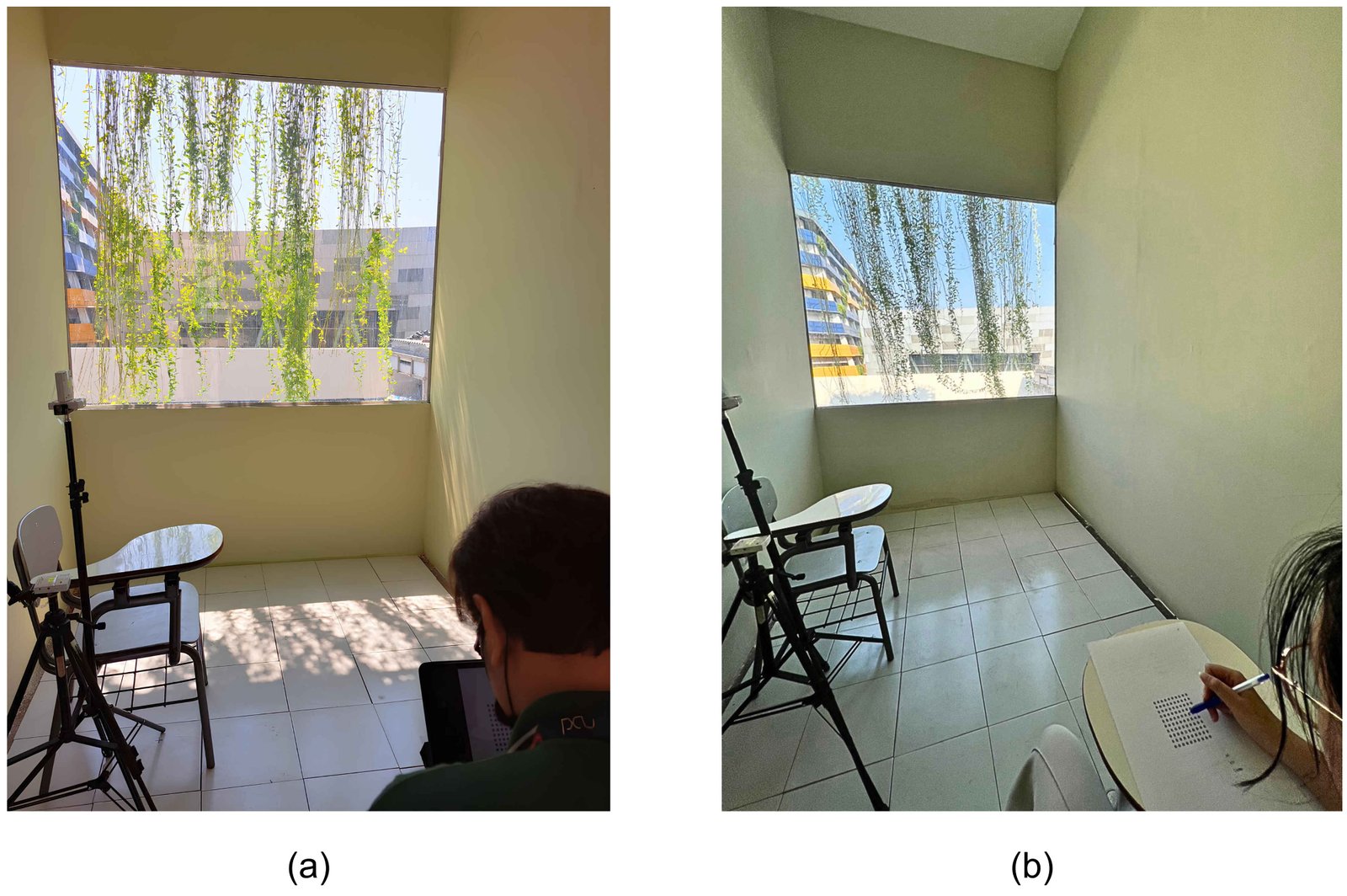 Although Variant I with LAI 0,75 led to a luminance increase of 64,9% (side-window position) and 57,7% (window-facing position) compared to the condition without plants under diffuse lighting conditions, GSV remained in the range of “Acceptable and Just Acceptable”. Variant I reduced DGI by 3,3 points—from 30,4 to 27,1 (side-window position). For the window-facing position, DGI decreased by 2,3 points (from 28,9 to 26,6). Although luminance also increased by 5,9% (side-window position) and 7,2% (window-facing position) compared to the condition without plants for Variant II with LAI 1,5, GSV improved to “Just acceptable” (side-window position) and “Perceptible” (window-facing position). Variant II reduced DGI by 6,4 points—from 30,0 to 23,6 (side-window position) and for the window-facing position, DGI decreased by 6,3 points (from 28,8 to 22,5). These results indicated that Variant II with LAI 1,5 provided the best outcomes, both objectively based on measurements and calculations, as well as subjectively through user perception. Significantly, respondents’ evaluations continued to improve despite the increase in window luminance. It is asserted that DGI value in the range of 20–22 was considered comfortable [47,48].