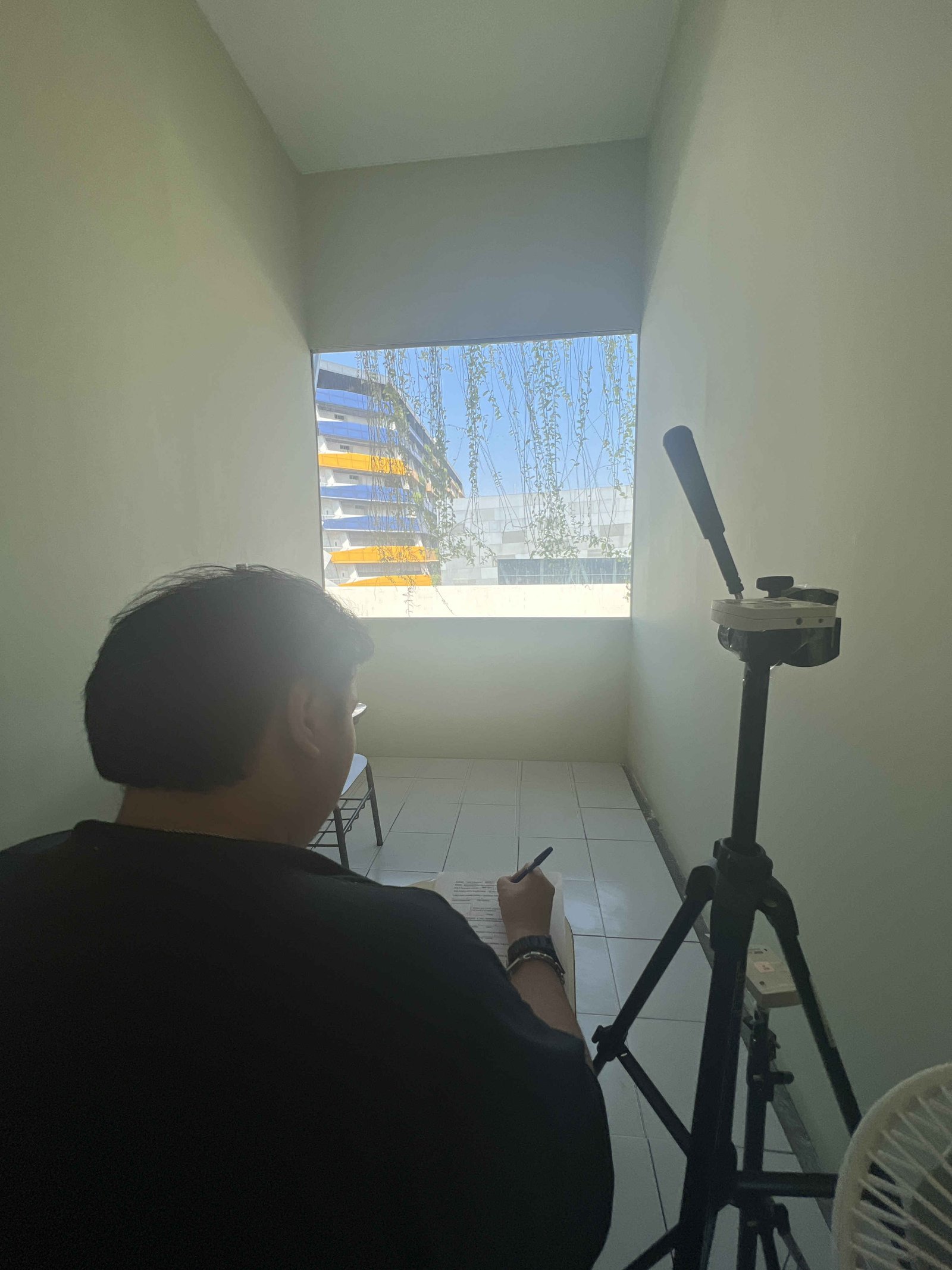 This study was conducted over 2 months, from September to October 2023. It took place at the East Campus of Petra Christian University, located in Siwalankerto subdistrict, Wonocolo district, Surabaya, East Java, at coordinates 7˚ 14’ 57” S and 112˚ 45’ 3” E. The experiment used a cubicle situated on the 7th floor, at an elevation of 23,76 meters from the ground level (+/-0.00), with a window-to-wall ratio (WWR) of 50% facing east. The setting represented a single-occupant workspace, measuring 2 m × 4 m with a height of 3,45 m. Surface reflectance values were 50% for the walls, 80% for the ceiling, and 20% for the floor. The only furnishings present at the measurement point were a chair with arm-table. Cubicle layout and elevation were illustrated in Figure 1.