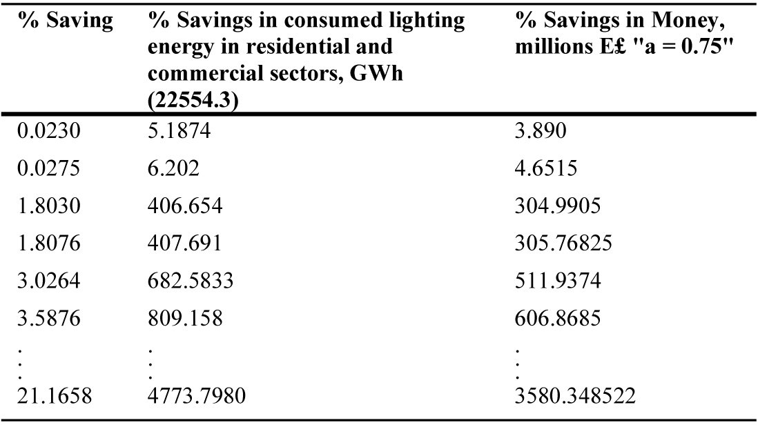 If the proposed methodology is applied for the Egyptian lighting system, commercial and residential sectors, considerable savings in energy and money will be achieved as shown in Table 21 assuming the average tariff = 0.75 E£/kWh [69,70]. Table 21 describes the growth in energy and money savings with this effective hybrid method. The savings in energies vary from 5.1874 to 4773.7980 GWh/y and the savings in money start from 3.890 up to 3580.348522 million E£, ≈ 223.7717 million $, for only one year.