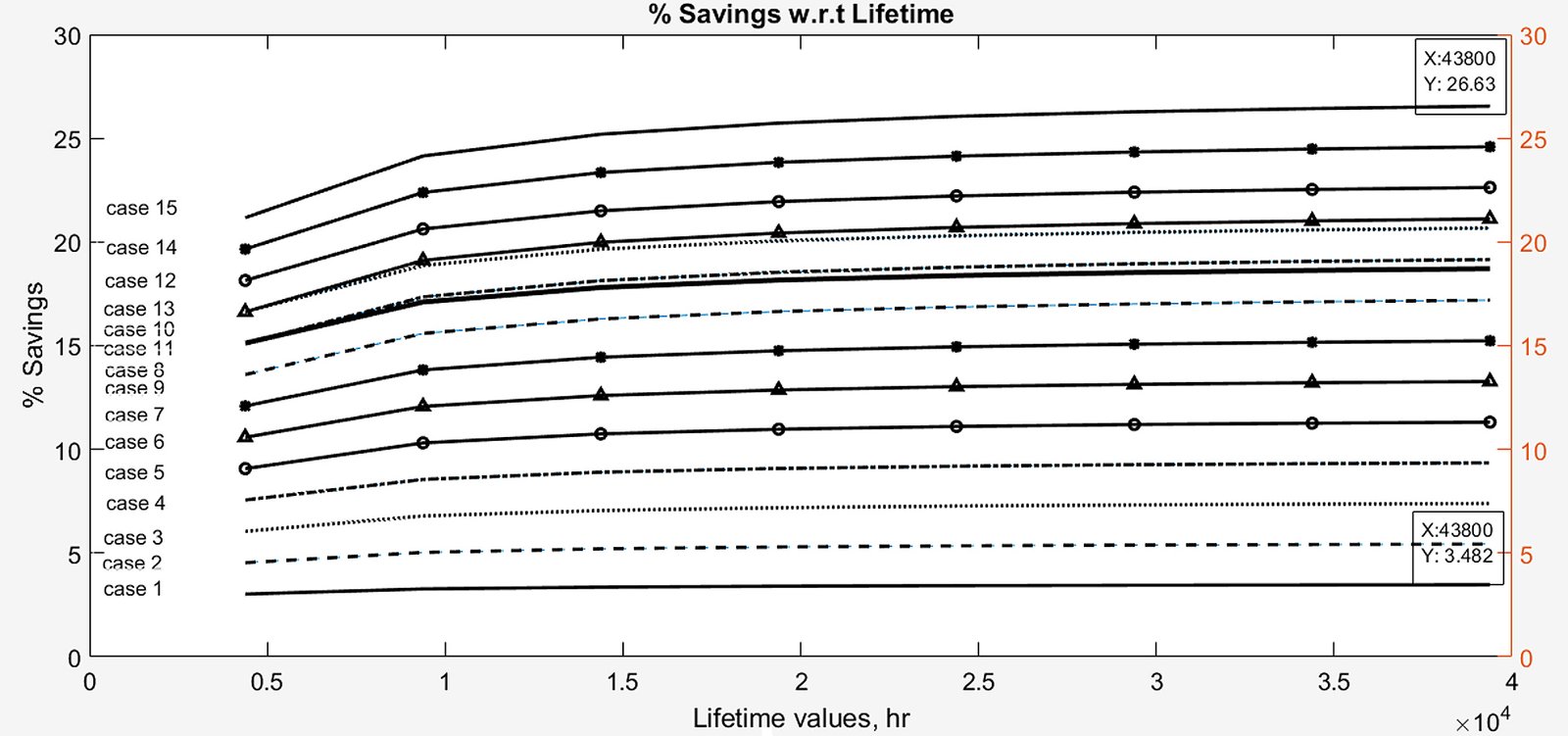 The user of the program can select any range of lifetime values to display the various percentage savings by the MATLAB® program.