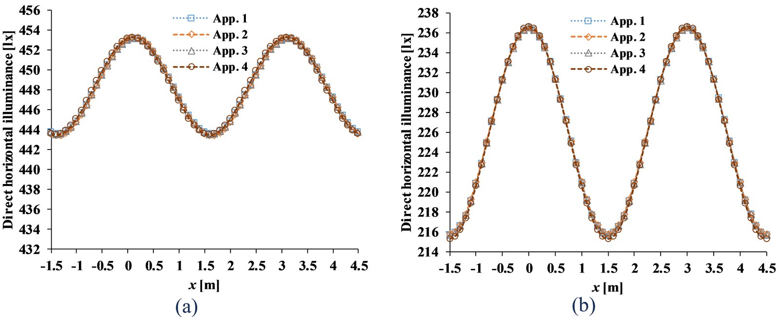 Fig. 9. Total direct horizontal illuminance ET(x) obtained using Approach 1 until 4, in the configuration with (a) yP = 1 m, δ = 1 m, BZ1 type; (b) yP = 1 m, δ = 1.5 m, BZ5 type.