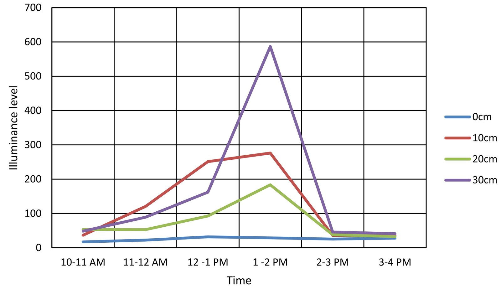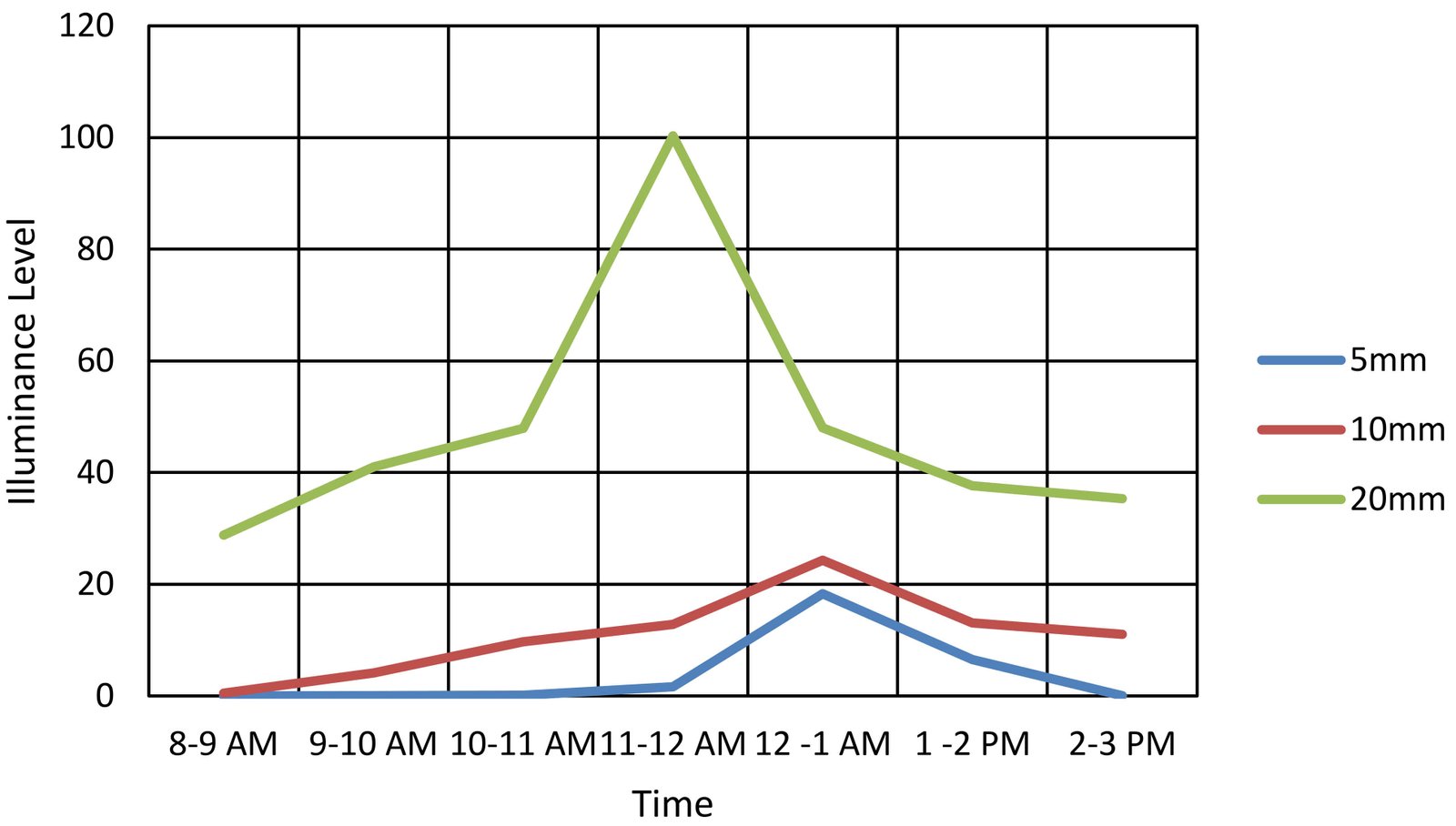 This experiment investigated the effect of the acrylic panel thickness on the overall transmitted light; while the tested variables were (5 mm, 10 mm, and 20 mm considering that the fixed variables in this experiment were the (20 cm) collector, the (20 cm) diffuser, and the white surrounding. The experiments were done during full days to figure out the levels of the transmitted light for a different solar altitude angles, as shown in Fig. 12.