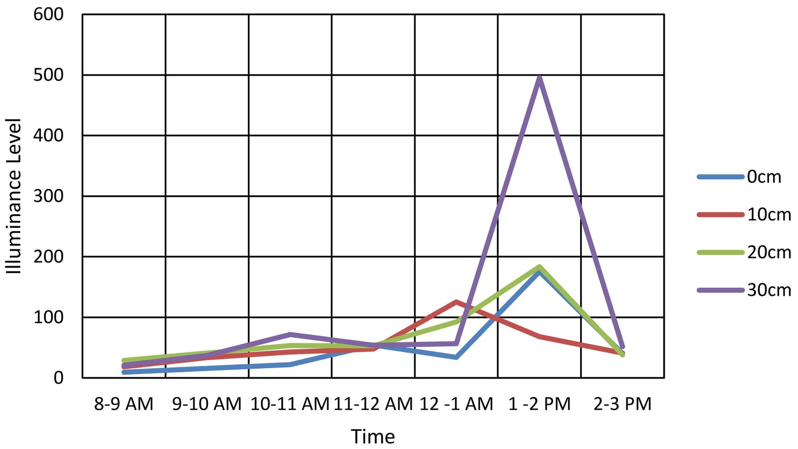 This research revealed that the illuminance level distribution inside the room depends on the time of the day and the center location inside the room receives more consistence light levels, as shown in Table 7 and Fig. 20.