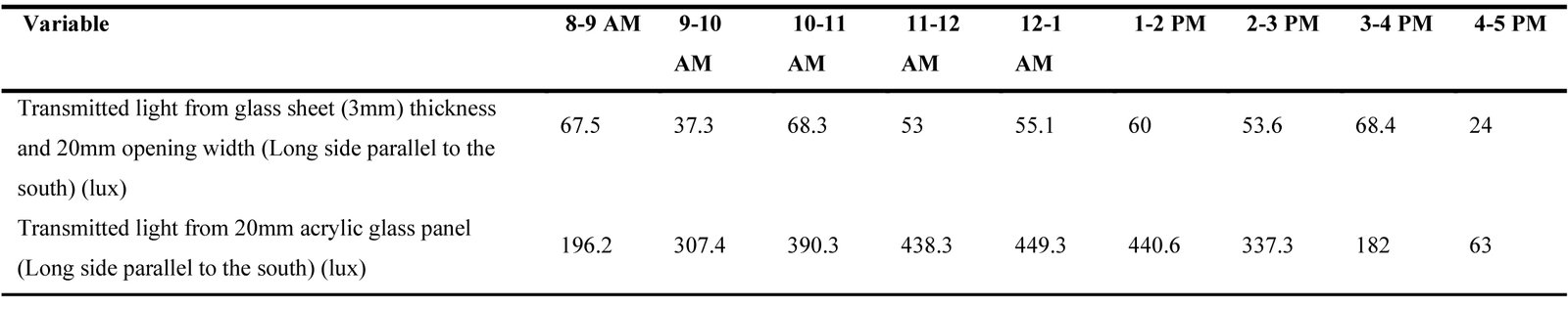 This research found that acrylic glass panel could transmit light 7-8 times greater comparing to an opening covered with the glass with same opening width as shown in Table 1 and Fig. 5 below. The maximum illuminance level was (449.3 lux) for the acrylic glass panel in comparison with (55.1 lux) for the glass sheet.