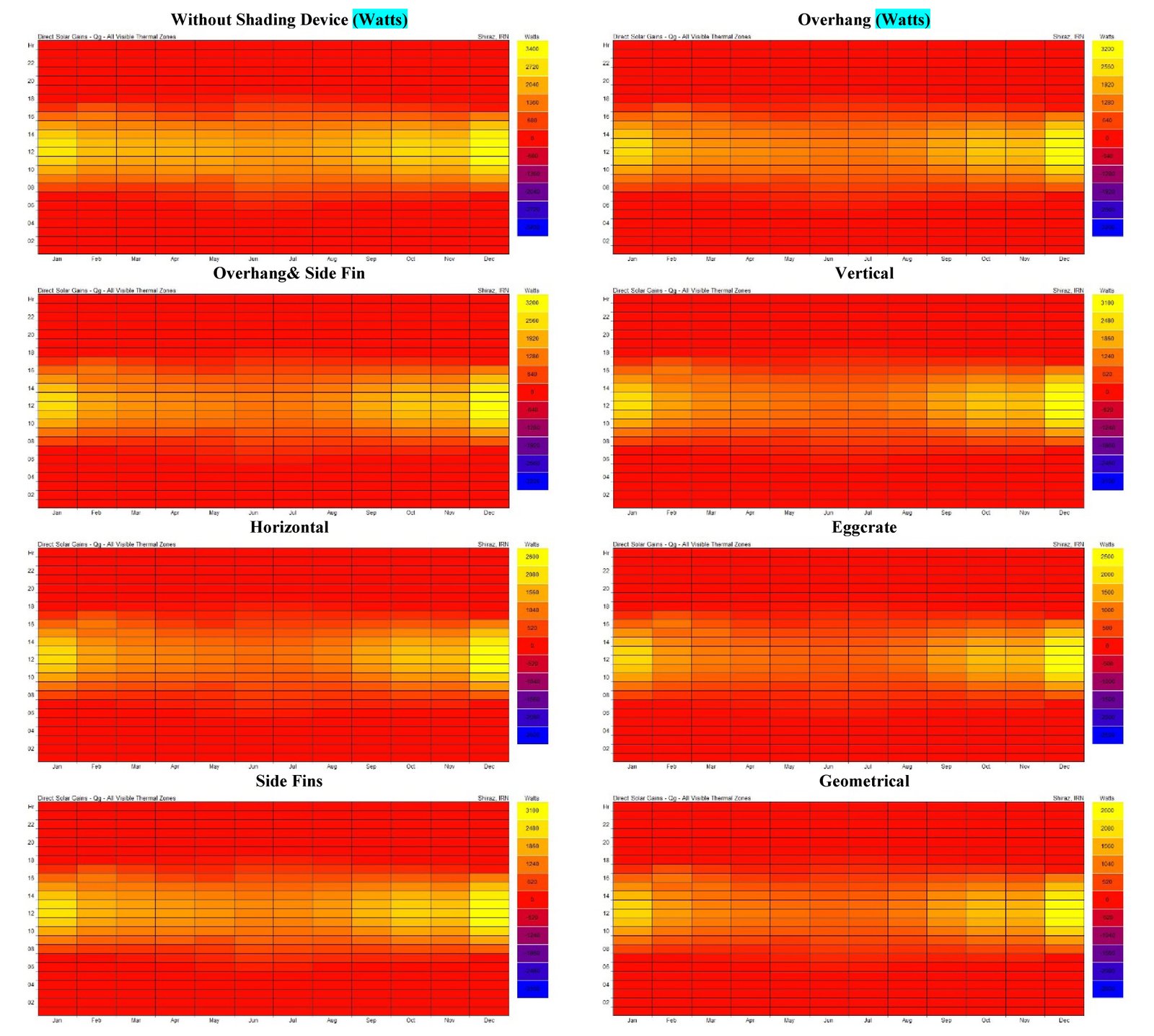 As shown in Fig. 17 with the red circle of numbers in watts, eggcrate, geometric and vertical shading devices have the best control over the amount of sunlight entering during the warm seasons.