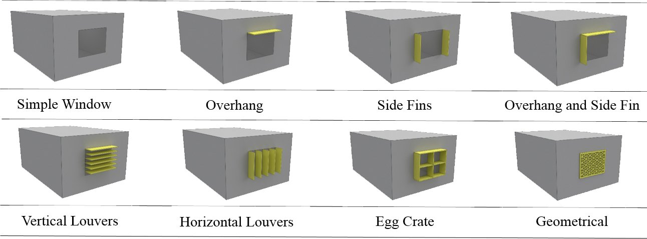 Fixed shading design is determined by the height of the sun and azimuth when the shadow is needed. On the one hand, horizontal shadows generally have the greatest effect on the south side, and the length of the ridge is estimated by considering the altitude angle of the sun. Azimuth, on the other hand, is an important factor for vertical shading used on the east or west side where solar height is low. In order to increase the protection speed while shortening the protrusion length, it is effective to install vertical fins at short distances. Eggcrate-shaped shadows combine vertically and horizontally, regardless of orientation, taking into account both solar and azimuth heights. However, one of the disadvantages is that the function of natural light is lost due to excessive protection [13]. Figure 4, shows the modeling of the different types of external fixed shading devices that are placed and analyzed on the south façade’s windows of the residential building.