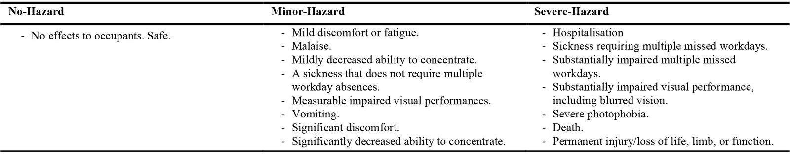 The consequent (flicker effects on humans) of hazards are tabulated in Table 11 as follows (adapted from [4]).