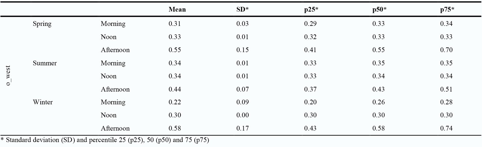 West Orientation (o_west): As Table 3 shows, the o_west shows a similar behavior to the o_north with a gradual increase in the DGP values along the day and an opposite behavior regarding the o_east. This means that, in this orientation, DGP values increase from morning to afternoon. When analyzing the seasons, it can be observed that during the mid-season, morning values begin in no glare condition (DGP 0.31), remain steady at noon (DGP 0.33) and increase in the afternoon reaching a DGP value of 0.55. As shown in the box plot (Fig. 3), mornings and noon periods along all seasons present no glare conditions, with spring and winter mornings displaying the main dispersions, reaching DGP values of 0.03 and 0.09 respectively. However, the main dispersions along the day take place during the afternoon periods along all seasons with SD values reaching 0.15, 0.07 and 0.17 in spring, summer and winter, respectively. When going deeper into the analysis of afternoon periods along all seasons, the lower and upper quartiles are within glare values (DGP > 0.38).