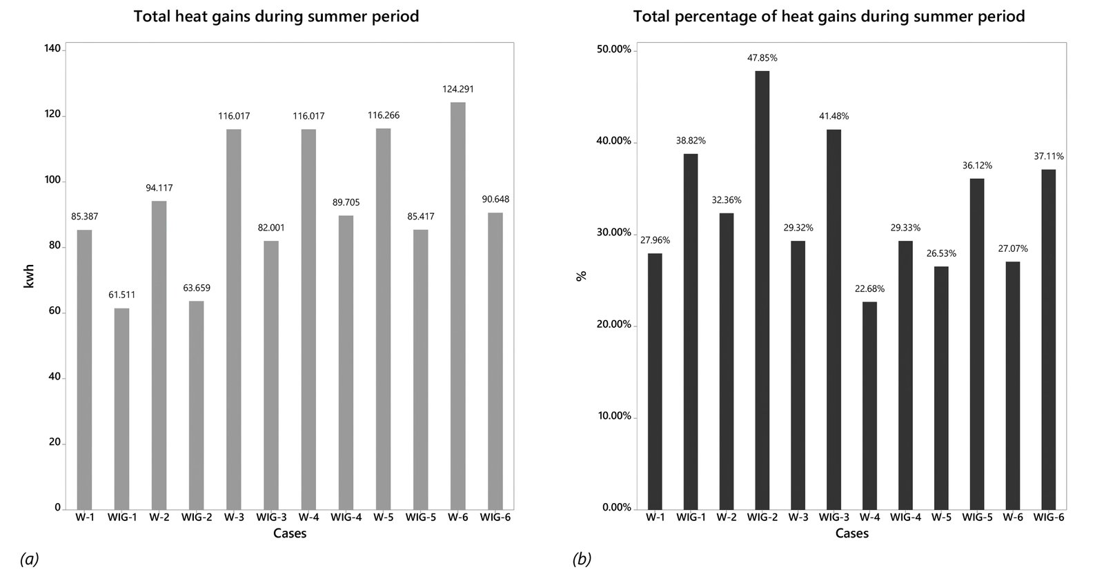 The VGW set on the south wall made it significantly reduce the monthly HGs compared to the case of reference room with bare wall as shown in Fig. 20. The reduction in HGs is due to the reduced heat flux provided by the VGW system and low OTTV values, which lower the heat flow absorbed by the green facades by their presence. The simulations results showed that the HGs for the reference room with bare walls seniors (BW-1 to BW-6) for whole cooling season (summer period) were 85.38 kWh, 94.12kwh, 116.02kwh, 116.02kwh, 116.27kwh, and 124.29kwh respectively. The presence of VGW system seniors (VGW-1 to VGW-6) have decreased HGs by 38.82%, 47.85%, 41.48%, 29.33%, 36.12%, and 37.11% respectively, or a heat gain of 61.51kwh, 63.66kwh, 82.00kwh, 89.71kwh, 85.42kwh, and 90.65kwh respectively, compared to the reference room, unlike the reference room with bare walls (BW-1 to BW-6) where the total HGs only represents 27.96%, 32.36%, 29.32%, 22.68%, 23.09%, and 27.07% respectively (Figs. 21(a) and (b)).
