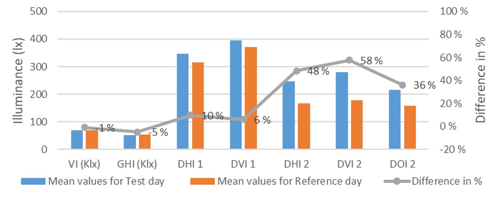 Independent t-test is used to compare Mean values of the independent variables (VI and GHI) with the Mean values of the dependent variables (DHI 1, DVI 1, DHI 2, DVI 2 and DOI 2) and to draw a picture about the effect of the HLP presence during the test days. Difference presented in the figures following tables shows relative difference between Mean values of test and reference days (Test-Ref)/Ref), thus showing the improvement (in %) for the test comparing to the Ref.