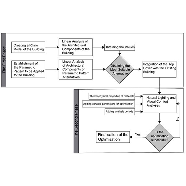 The re-functioning of historical buildings frequently necessitates new additions. This is particularly relevant for historical buildings with open courtyards, where interventions often involve the installation of upper covers using contemporary materials and techniques This issue can become especially apparent in historical buildings that are completely enclosed with transparent materials, raising concerns about the greenhouse effect and its potential to compromise indoor comfort.